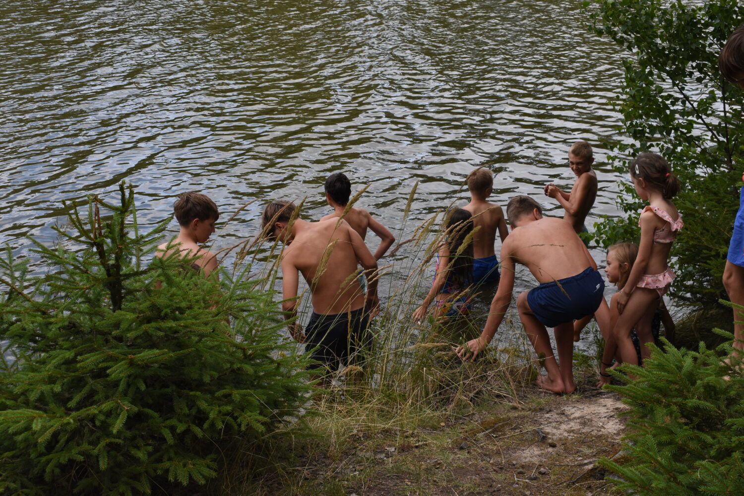Po hodnocení přístřešků jsme se šli vykoupat do rybníka. Ovšem oproti minulému roku jsme museli zvolit namísto rybníka Hrachovce kvůli jeho částečnému vypuštění rybník Hrachovec II (Nový Hrachovec), který se nachází jen asi 50 metrů vedle a také nám dobře posloužil.